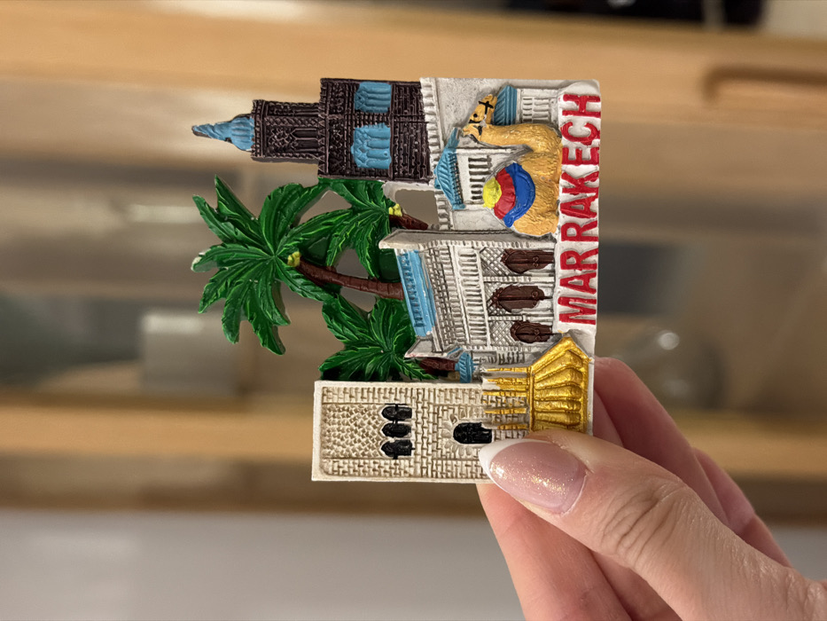The image displays a close-up view of a light-skinned hand holding a multi-colored souvenir magnet. The hand, specifically the thumb and index finger, exhibits a light pink, glittery French manicure with white tips, grasping the lower left portion of the magnet. The magnet itself is a three-dimensional, relief-style object designed to represent various Moroccan landmarks and symbols. From left to right, the magnet features: a light beige, textured minaret-like structure with two dark arched windows and a detailed top; a small, golden, corrugated dome; several vibrant green palm trees with yellow fruit accents positioned behind a series of white and grey buildings with traditional Moroccan architectural elements and blue-domed roofs; a dark brown minaret with intricate detailing and blue arched windows; and a beige camel adorned with a colorful saddle featuring blue, red, and yellow segments. The word "MARRAKECH" is prominently displayed in red capital letters across the bottom of the magnet. The background is heavily blurred, consisting of indistinct shapes and warm, light brown tones, indicative of an indoor setting, possibly featuring wooden furniture or wall paneling. The image does not contain any visual information to determine a specific location within the city of Casablanca, Morocco; the souvenir magnet itself explicitly references Marrakech.