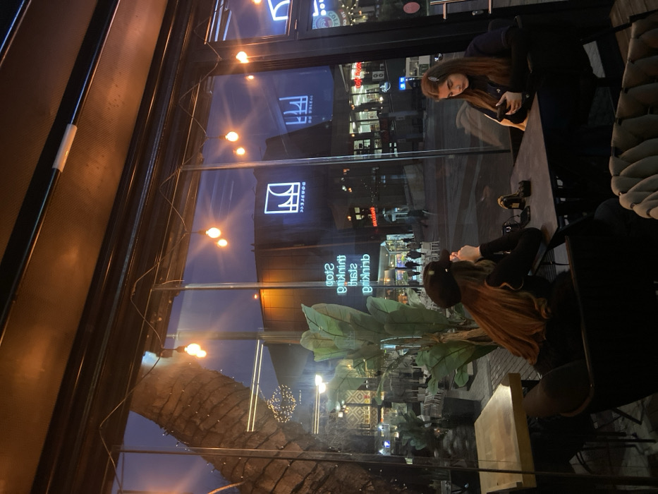 - "The image captures an indoor perspective from a cafe or restaurant looking out through large glass panels onto a city street at night" by FM-Z7t2i1, licensed under CC BY 4.0