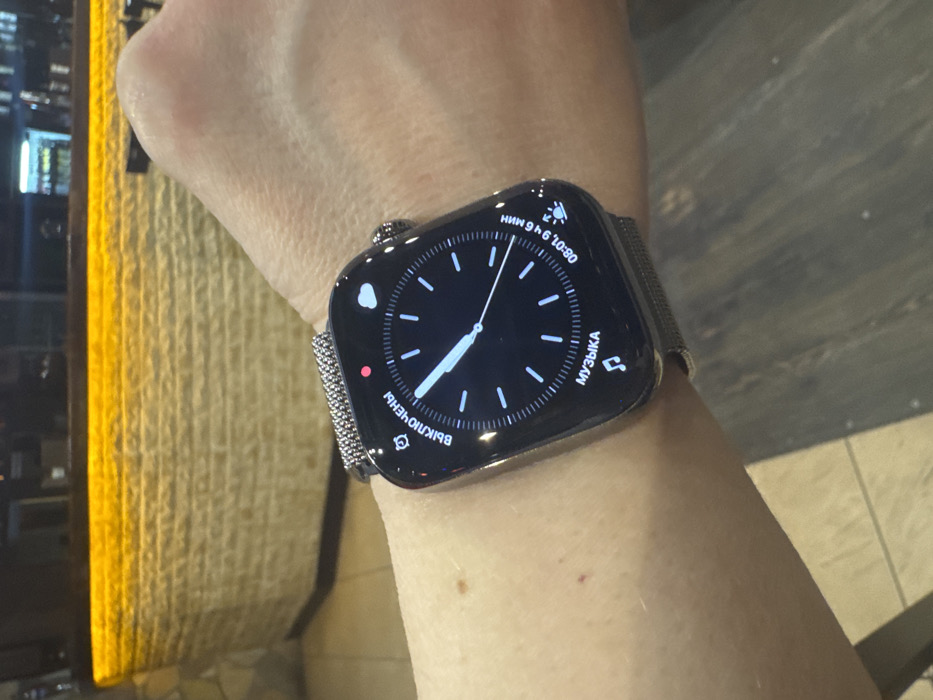 A close-up image depicts a person's left wrist wearing a dark-cased smartwatch with a silver Milanese loop band