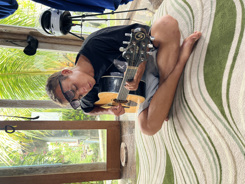 A man with sunglasses plays a guitar while sitting cross-legged on a rug with green and white waves. He wears a black shirt and grey shorts. A window with green foliage is visible in the background, along with a helmet on a tripod. The composition is taken indoors, likely in a casual, relaxed setting.