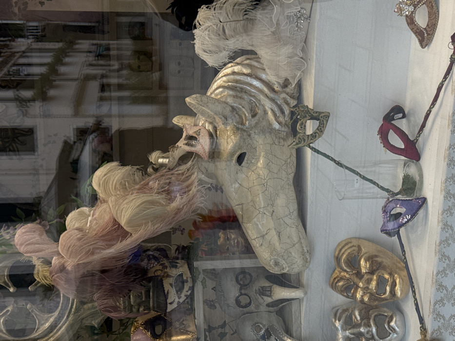 A window display showcases Venetian masks. Central is a decorative horse head mask, white with crackled texture and adorned with feathery plumage. Other masks are visible, including a gold, weeping face and smaller eye masks on sticks in red, purple, and gold. Reflections of buildings and architectural details are visible on the window's surface, adding depth and a sense of location.