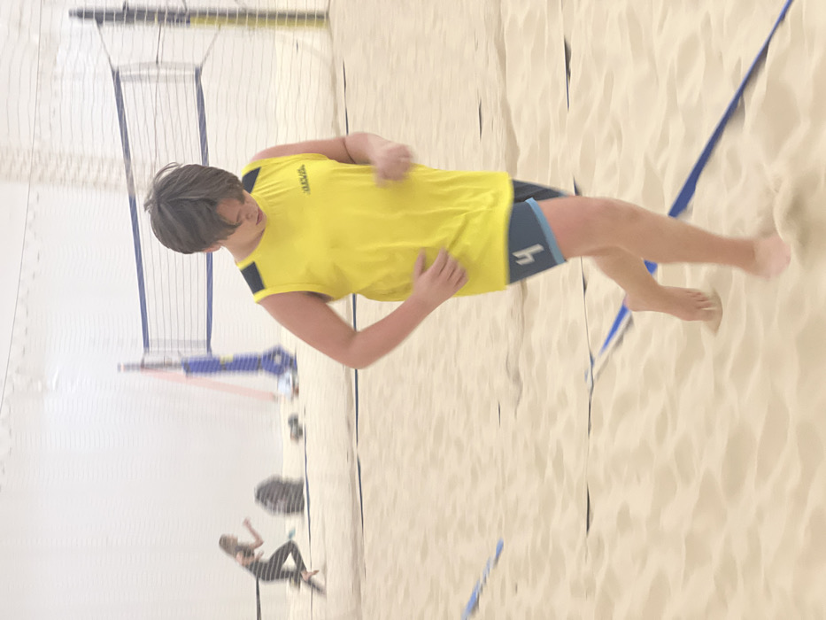 A person in a yellow athletic shirt with black shoulder accents and blue shorts stands barefoot on a sand surface. The shorts have a large white "4" on the side. Behind, there's a volleyball net. Further in the background, another person appears to be kneeling or sitting on the sand. Blue tape marks lines in the sand. The setting seems to be an indoor beach volleyball facility.