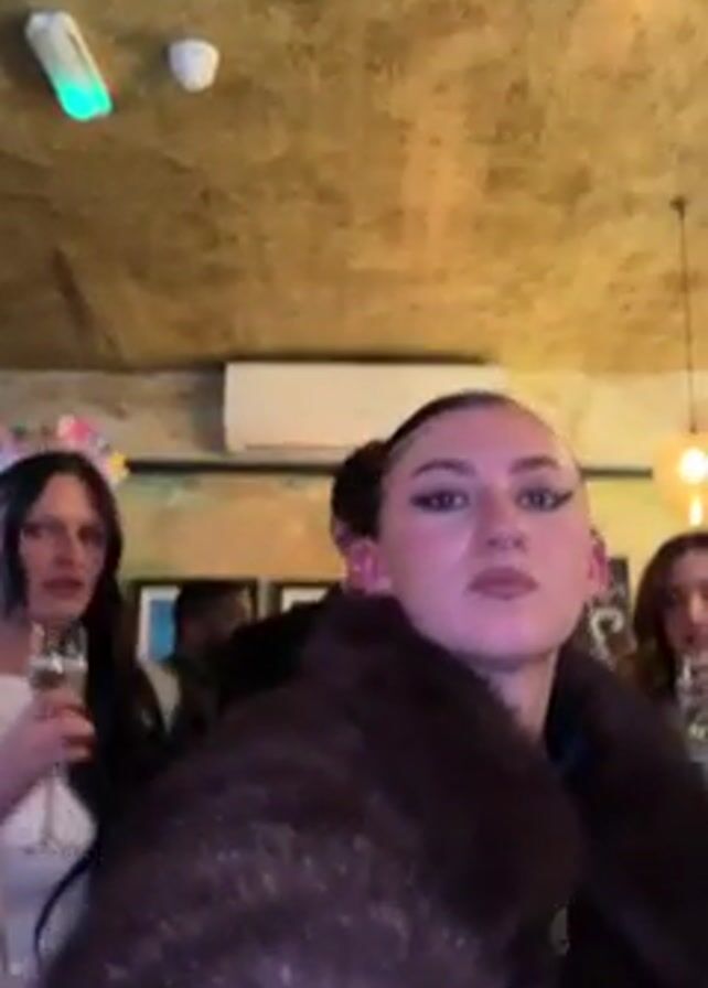 A medium shot captures a birthday celebration inside a restaurant or bar. A woman with long black hair wearing a "birthday" tiara and a white fur coat lifts a champagne flute towards the camera, toasting the occasion. Behind her, several people are visible, including a woman in a brown fur coat who looks towards the camera and a man holding a phone. The room is dimly lit with an air conditioner mounted on the wall. The ceiling has a textured, mottled appearance. Other individuals are partially visible in the background, adding to the crowded atmosphere.