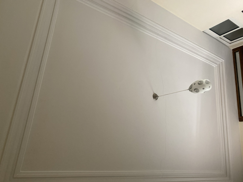 The image displays an interior ceiling within a structure located in Meknes, Morocco. The ceiling is painted white and features white, multi-layered decorative crown molding forming a rectangular perimeter. A single pendant light fixture hangs from the ceiling via a thin cord, attached to a brushed metal canopy. The light fixture's shade is egg-shaped, made of white glass, and patterned with dark concentric circles. Several subtle, thin hairline cracks are visible on the white ceiling surface, running horizontally from the left side of the frame towards the light fixture. Portions of a light-colored wall are visible along the bottom and right edges of the frame. In the lower right corner, a section of a multi-pane window or glass door with dark frames and white trim is partially visible. No individuals or active events are present in the scene.