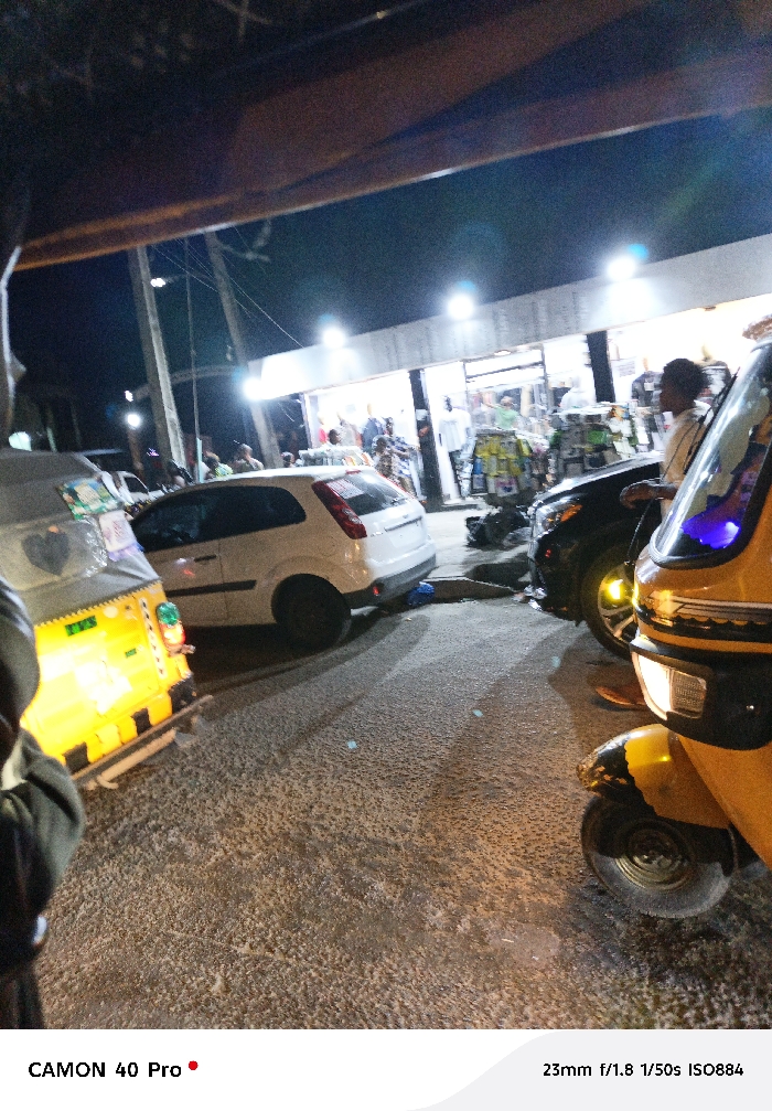 An urban scene at night features a street with multiple vehicles. A bright yellow auto-rickshaw dominates the right foreground. To the left is a white compact car, followed by another partially visible auto-rickshaw. In the background, a building with brightly lit storefronts has people milling about. Above, electrical wires and a beam add to the busy atmosphere. The road surface is textured, illuminated by the vehicle lights and street lamps. The image details indicate a CAMON 40 Pro camera was used with settings of 23mm f/1.8, 1/50s, and ISO884.