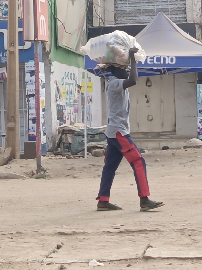 In Fagge A, Nigeria, a male individual walks right to left on a dirt path under daylight conditions. He is seen in profile, wearing a light grey short-sleeved polo shirt and dark blue pants with prominent red panels on the outer thighs and lower legs. On his head, he balances a large, transparent plastic bag filled with numerous small, brightly colored packaged items, potentially snacks or commodities, secured with a knot at the top. His right arm is slightly raised, hand near the bag for stability. He wears dark, low-profile footwear. The immediate foreground consists of uneven, light brown dirt with small cracks and debris. In the background, to the left, a red and white striped pole is visible, partially obscuring a building with a light green trim and white wall adorned with multiple posters and flyers, some promoting mobile phones or electronics (e.g., "SPARK"). Below these posters, several stacked sacks or bundles are present. To the right of the walking individual, a blue and white tent structure with "TECNO" branding is visible. Further right, a building with closed metal security doors is discernable. The scene suggests a bustling urban or semi-urban commercial street.