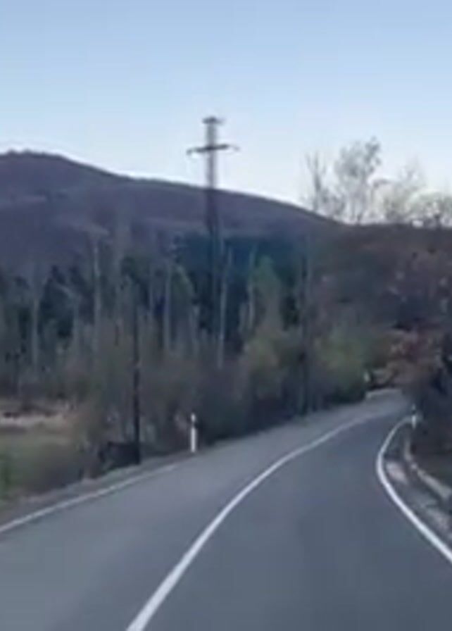 view from a car driving on a winding road. The road has a white dividing line and white lines on the sides. On either side of the road are trees and bushes, some with bare branches. In the background are hills or mountains. There are power lines above the road. Some road signs are visible on the right side of the road. The sky is a light blue with some clouds.