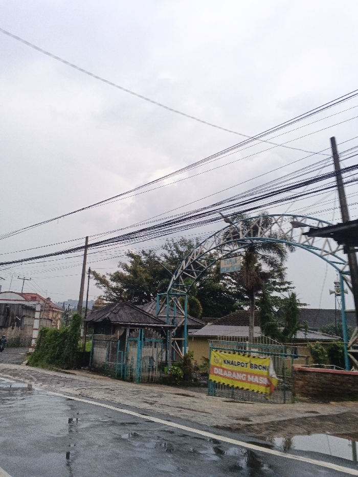 The image presents an outdoor street scene in Carmen, Philippines, under an overcast sky, with a wet asphalt road indicating recent rainfall. In the foreground, the wet asphalt road curves slightly from left to right, featuring a solid white line bordering its right edge. On the far left, a dark-colored motorcycle with a rider is partially visible on the road, moving away from the viewer. Behind the road on the left, a property features a light-colored building with a red roof, partially obscured by green vegetation and a metal fence. A dark utility pole stands upright on the left side, supporting multiple overhead power lines that traverse the upper half of the frame. On the right side of the road, a wide, wet paved area serves as an entrance, spanned by a prominent archway constructed from light blue and white metal trusses. A sign, partially obscured by utility lines, is affixed to the archway, displaying text that appears to be "TAMAN". Directly beneath and to the left of the archway stands a small, dilapidated structure with a corrugated metal roof and a light blue metal gate. Various trees and green foliage, including palm trees, are visible behind the structures and archway. To the right of the archway entrance, a large yellow banner with black and red text is prominently displayed on a gate. The text, written in Indonesian, reads "KNALPOT BRONG DILARANG MASUK," which translates to "LOUD EXHAUST PROHIBITED ENTRY." Further right, another utility pole supports a visible loudspeaker or security device. A light-colored building with a dark roof is partially visible behind the banner.