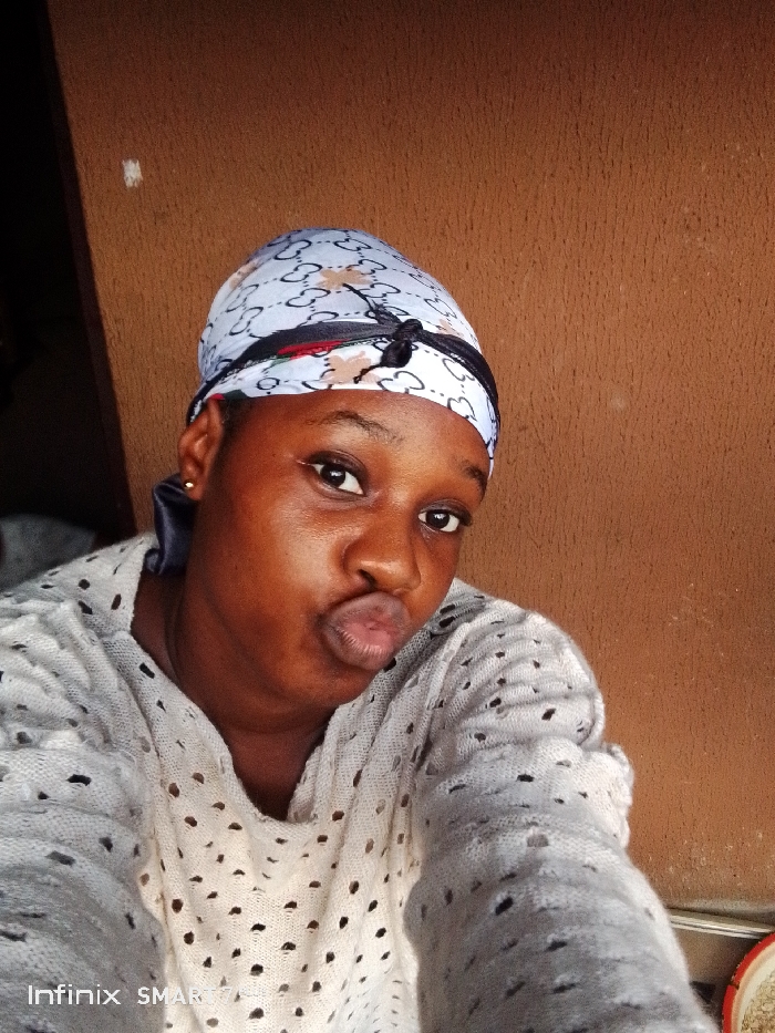 A young, dark-skinned woman pouts at the camera. She wears a patterned headscarf with a black tie and a light gray, holey sweater. A gold earring is visible on her left ear. She has dark eyes and full lips. The background consists of a brown wall and a partially visible doorway. The "Infinix SMART 7" watermark is at the bottom left.