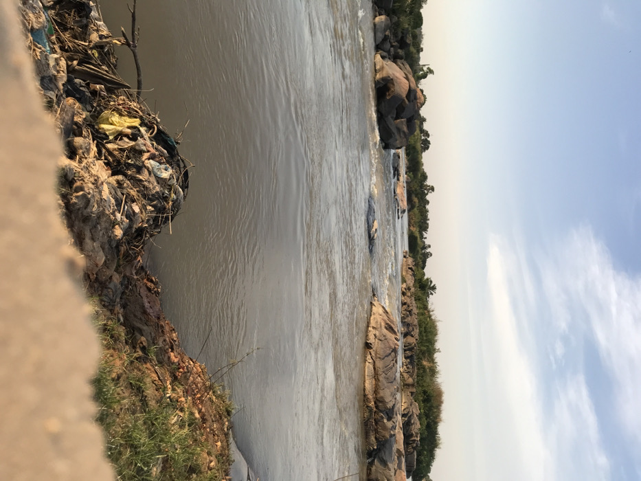 A river flows from left to right, with the bank on the left featuring trash and vegetation. The water is turbid. The opposite bank is rocky with some vegetation. The sky is visible with wispy clouds. The image is oriented sideways.