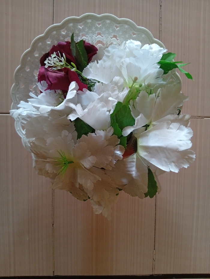 An artificial floral arrangement is suspended against a light brown tiled wall in Barnawa, Nigeria