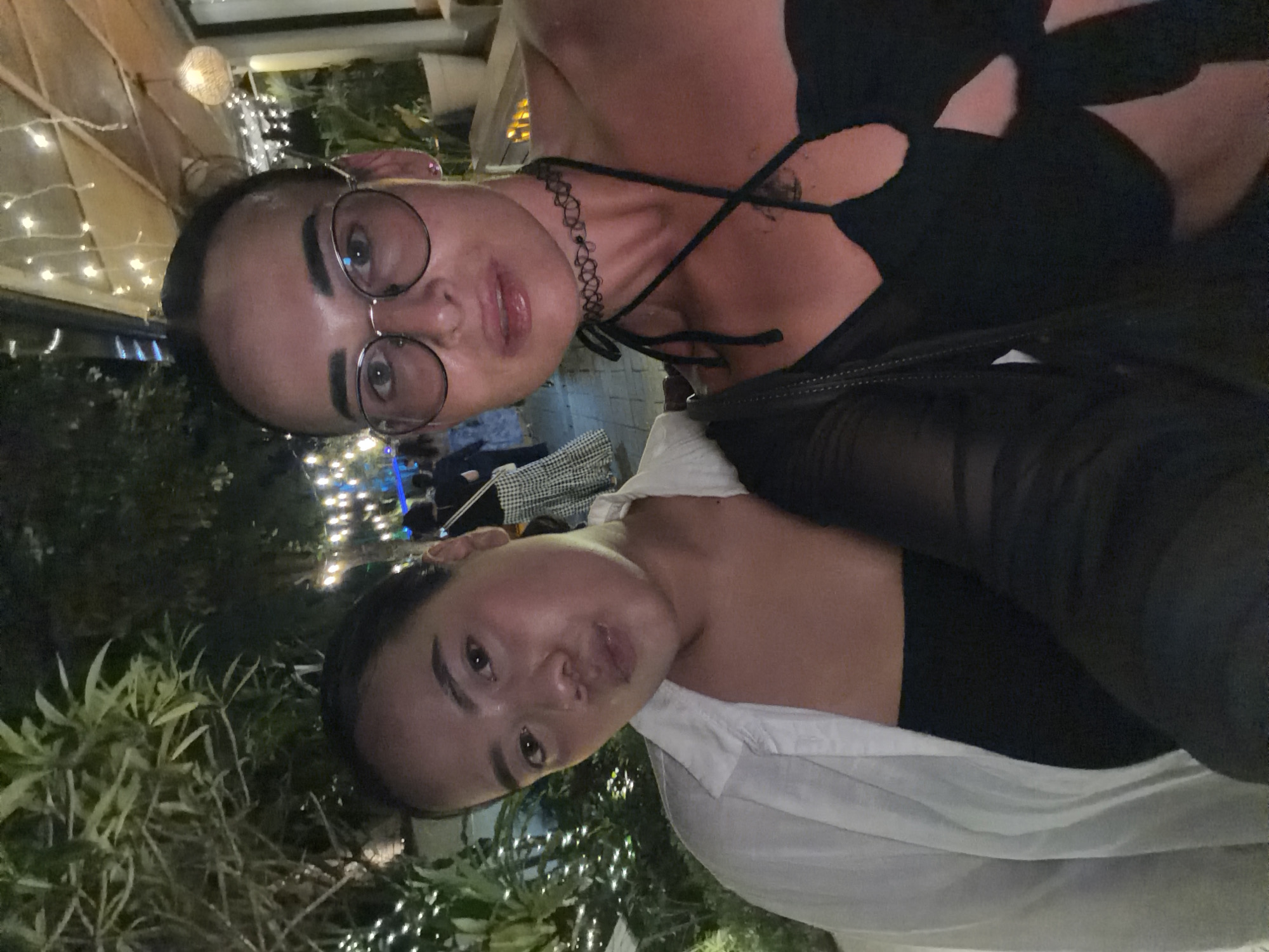 Two women are posing for a selfie in Nusa Dua, Indonesia. The woman closest to the camera wears round eyeglasses and a black choker necklace with a black top. A partial view of a black jacket over her shoulder and the top of a black purse are visible. The woman behind her wears a black top covered by a white button-down shirt. The scene appears to be outdoors at night, with plants, trees, and string lights in the background. There are other people in the background illuminated by bright lights.