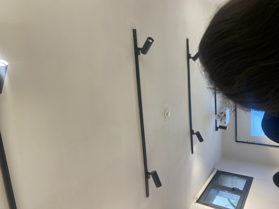 This image depicts the interior of a room within a building in Fez, Morocco, observed from a low vantage point behind a seated individual. The white ceiling is equipped with three parallel black track lighting rails, each containing multiple active black, cylindrical LED spotlights. A small, circular, white smoke detector is centrally mounted on the ceiling. On the left wall, a dark-framed rectangular window shows faint green foliage outside. Towards the front of the room, a white projection screen or whiteboard displays blue-tinted text and graphics. A white multimedia projector is mounted on the ceiling above this screen, connected by visible wiring. In the immediate foreground, the back of a person's head with dark, wavy hair occupies the lower right, partially obscuring the view. A small portion of another person's head/shoulder is visible in the lower left. The scene suggests a presentation or educational environment.