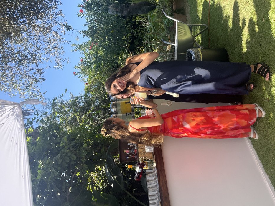 The image depicts an outdoor daytime gathering in a lush garden or backyard environment. The specific location within Hof HaCarmel Regional Council, Israel, cannot be determined from the visual evidence. Three young females are present near a temporary bar setup on a sunny day. * To the left, a female with long, wavy brown hair styled in a half-up bun wears a red and orange floral-patterned maxi dress and white sandals. She holds a clear plastic cup with a pink liquid and faces towards the right, engaging with the others. * In the center, partially obscured, a female with dark hair and a dark top holds a clear glass with a light-colored beverage. She is positioned between the other two. * To the right, a female with dark hair wears a navy blue slip dress and black sandals. She smiles directly at the camera, holding a clear glass with a light-colored beverage. Her right hand is raised to her cheek. The bar setup features a white counter with a wooden top. On the counter, a row of clear empty drinking glasses is visible, along with several liquor bottles, including a visible bottle of Campari, arranged on a wooden tray. Behind the counter, two large, silver-topped beverage dispensers contain a yellow liquid. A white canopy extends over a portion of the bar area from the upper left. The background consists of dense green foliage, various trees, and flowering plants with red blooms. A dark-colored garden statue is partially visible among the plants in the mid-right. A silver wheelbarrow containing a black trash bag is positioned on the grass to the right. Several potted plants are also visible near the wheelbarrow. The ground is covered with green grass under a clear blue sky.