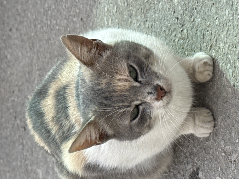 - "A dilute calico cat, featuring a coat with grey, white, and light brown/cream patches, is observed sitting on a grey, textured ground surface" by FM-pVyh13, licensed under CC BY 4.0