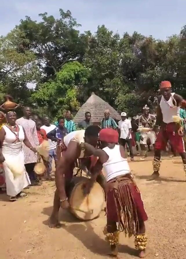 group of people gathered outside in a dusty area with trees in the background, likely a cultural event or performance. The focus is on a man in a white tank top and red shorts playing a large drum, while a child in a matching outfit with a red hat dances in front of him. Other people are watching, some with smaller drums. At one point, the child falls over. A hut with a thatched roof is visible in the background.