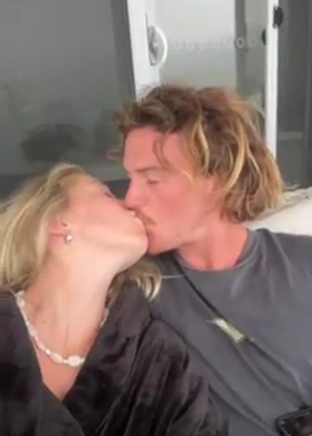 A young, blonde-haired woman wearing a dark robe and pearl necklace sits close to a fair-skinned man with wavy, light-brown hair and a mustache, who wears a gray t-shirt. The woman looks up at the man, then both smile and stick out their tongues. The man holds a cell phone in his hand. They are sitting on a wicker-style couch in what appears to be an indoor space. A glass door is visible behind them.
