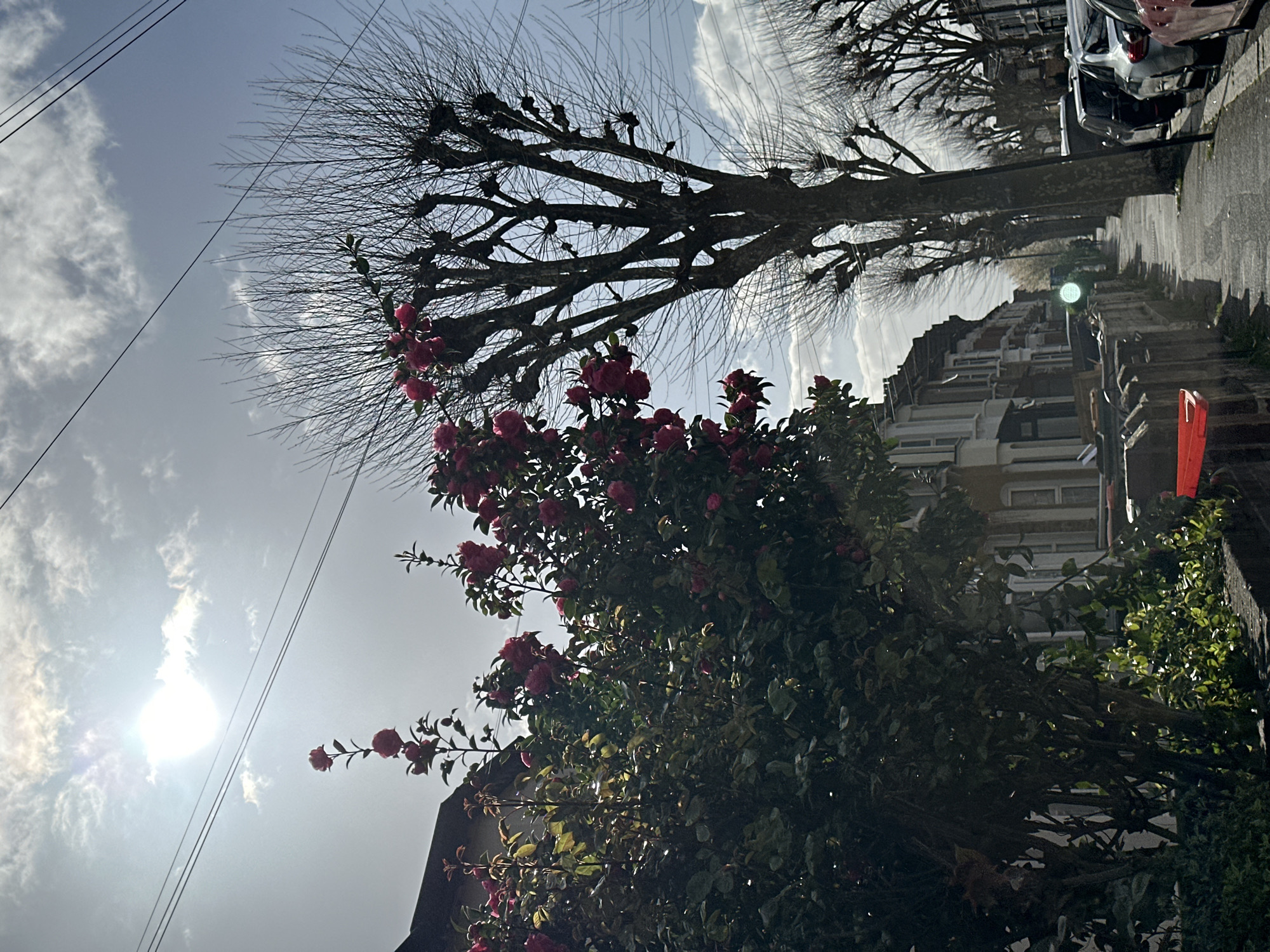 street scene in London, United Kingdom, taken on a sunny day. The camera is tilted approximately 90 degrees counter-clockwise. In the foreground, a large bush with red flowers is present. Above and slightly behind it, a bare tree with pruned branches is visible against a cloudy sky with a bright sun. Power lines are visible against the sky. Along the street, terraced houses with multiple floors can be seen on both sides. Cars are parked along the side of the street. The sidewalk is on the right side of the image.