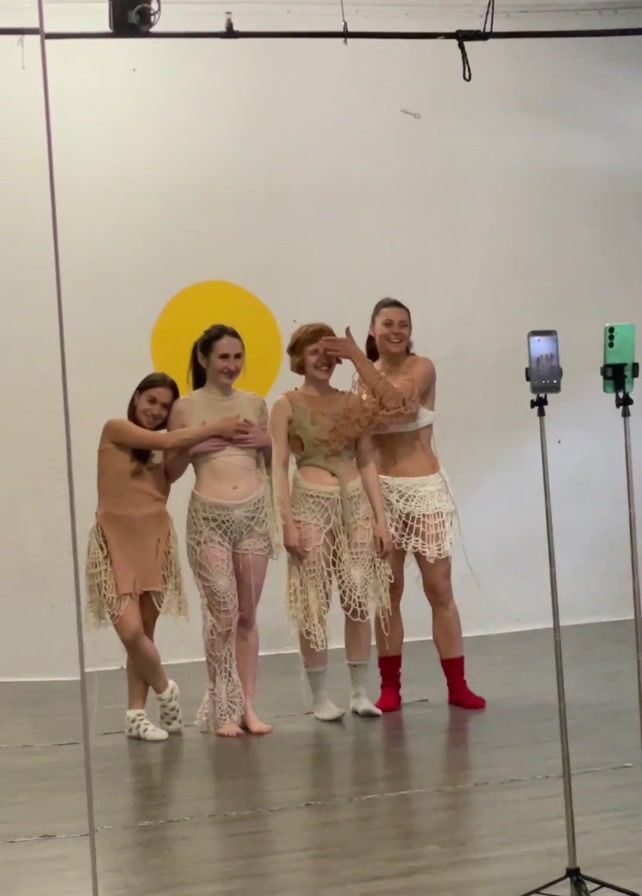 four young women posing in front of a mirror. They are standing side-by-side. The woman on the left is wearing a tan top and matching shorts with a sheer crocheted overlay. She has dark hair and is wearing white sneakers. The next woman is wearing a similar outfit with a nude tank top and crocheted shorts and shawl. She has long dark hair and is smiling. The third woman has red hair and is wearing a green tank top and crocheted shorts and shawl. She is also smiling. The fourth woman has long dark hair in a ponytail. She is wearing a white sports bra and crocheted shorts with a shawl, and she is wearing red boots. There is a large yellow circle painted on the white wall behind them. Two smartphones are on tripods to the right of the women. The floor is grey. All of the women appear to be laughing and enjoying themselves.