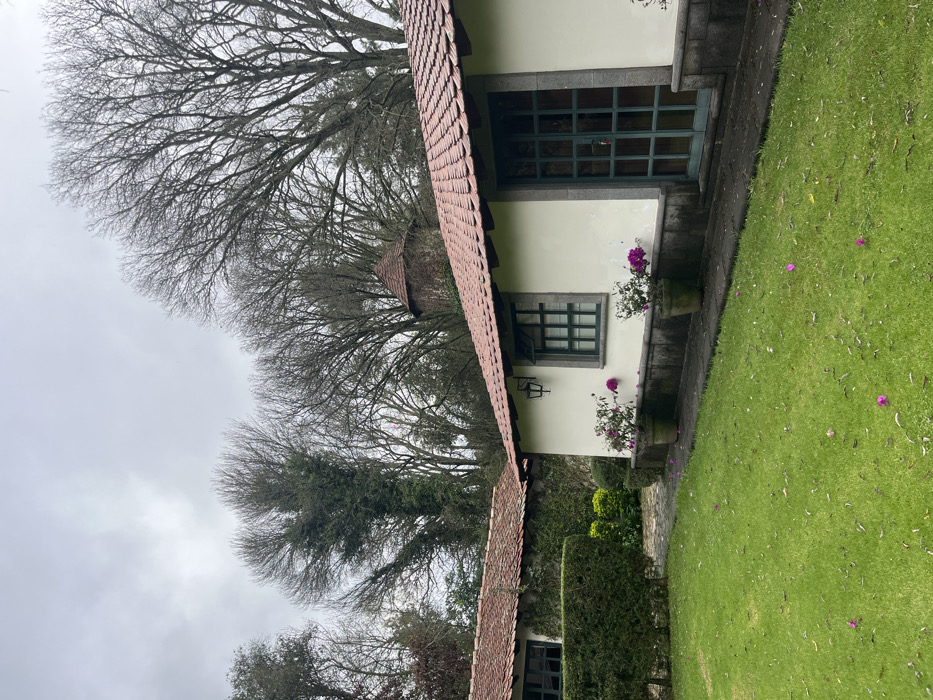 This image depicts a tranquil outdoor scene in Huasca de Ocampo, Mexico, under an overcast sky. The foreground features a well-maintained green lawn with scattered purple flower petals. To the right, a light-colored building with a terracotta tiled roof stands prominently. This building has a dark-framed window with multiple panes and a dark green double door, also with multiple panes, framed by a dark stone surround. A black metal wall lantern is mounted above the window. Two dark pots containing flowering purple bougainvillea plants are positioned along the building's dark stone base. A narrow, dark stone path runs along the building's edge. In the mid-ground, to the left, another building with a similar terracotta tiled roof is partially visible. Its walls are covered in green vines, and a dark-framed window is discernible. A trimmed green hedge is positioned in front of this structure. Further in the background, a round stone tower with a conical terracotta tiled roof emerges amidst dense vegetation. The background is dominated by a multitude of tall, bare deciduous trees, indicative of a dormant season, against a light grey, cloudy sky. No individuals, animals, or direct actions or interactions are visible in the scene.