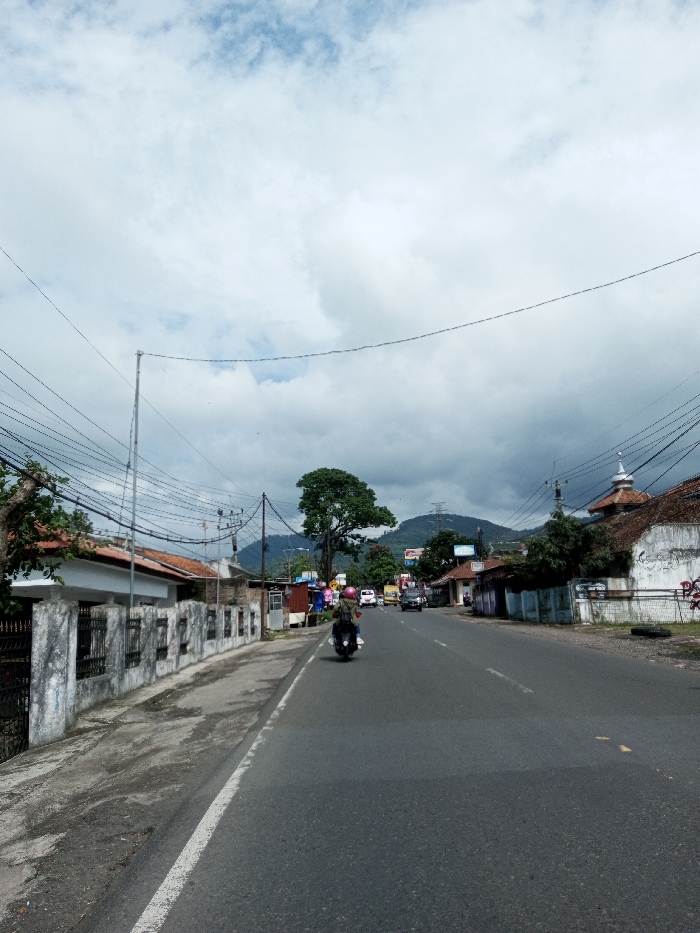 This image captures a street scene in Chagzam_Pam, Bhutan, under a predominantly overcast sky. The central feature is a two-lane asphalt road with a solid white line marking its left edge. A black motorcycle with two occupants, the rider wearing a pink helmet, travels away from the viewer in the right lane. Multiple cars are visible further down the road, also moving away. On the left, a concrete sidewalk runs parallel to a weathered, white concrete fence-like structure with rectangular cutouts. Behind this, a building with a reddish-brown tiled roof is partially visible. Numerous overhead utility wires are strung between several poles along this side of the road. On the right, a dirt shoulder precedes a series of buildings, including one prominent white-walled structure with a reddish-brown tiled roof and a distinctive dome topped with a finial. A large, mature tree with dense green foliage stands in the mid-ground on this side. In the background, mountains rise, featuring what appears to be a power transmission tower on a distant peak.
