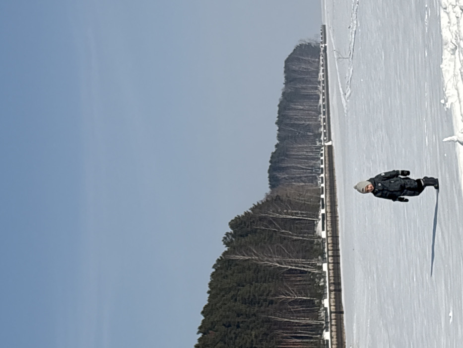 A solitary young child walks across the snow-covered frozen surface of the Kama Reservoir in Chaikovsky, Russia, under a clear blue sky. The child is dressed in a dark grey full-body snowsuit, black boots, black gloves, and a light grey knitted hat, moving from left to right with a slight smile on its face. A distinct shadow is cast by the child onto the bright white snow. In the background, a long, dark concrete or stone embankment, featuring regularly spaced white or light-colored caps, separates the frozen expanse from a dense shoreline forest. This forest consists primarily of dark green coniferous trees, interspersed with lighter-barked deciduous trees like birches, extending horizontally across the frame.