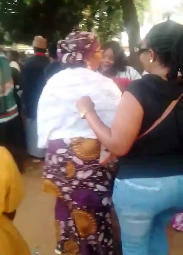 A group of people are gathered outside, possibly at a celebration or event. Several women are dancing in a circle. One woman is wearing a patterned headwrap and a purple skirt with floral designs, along with a white top. Another woman is wearing a red and white outfit, and a third is wearing a black t-shirt and jeans. There are other people standing and watching in the background. The scene takes place outdoors, with trees visible overhead.