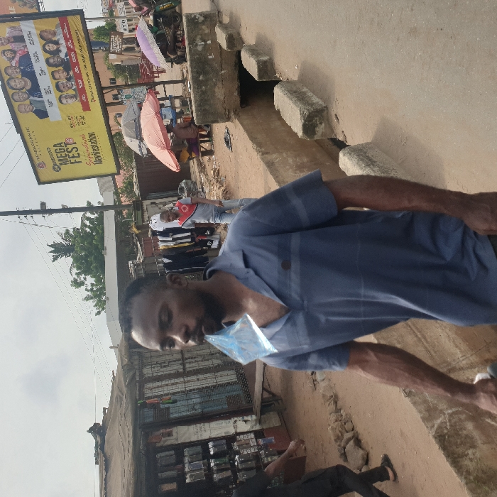 The image depicts an outdoor street scene in Onitsha, Nigeria, exhibiting elements of a commercial district. In the foreground, an adult male of African descent, wearing a blue polo shirt with horizontal stripes, walks towards the left, consuming a clear liquid from a transparent plastic sachet held to his mouth. He is positioned alongside a concrete drainage channel that parallels a paved road to his right. To the immediate left of the foreground subject, a makeshift stall, constructed from corrugated metal with a tarp roof, displays multiple items, likely phone accessories, on shelves. A partially visible individual in dark clothing walks past this stall. In the midground, several people are observed seated or standing under two large, open market umbrellas, one pink and one purple, indicating an informal gathering or market area. Clothes are displayed on racks adjacent to these umbrellas. Another male, wearing a gray t-shirt with red accents and light-colored trousers, walks in this area. The background consists of various buildings, green foliage, and an overcast sky. A prominent yellow billboard, mounted on a tall pole, advertises "MEGA FEST" and "Supernatural Manifestation," featuring multiple portraits and text, including a partial identifier "THE ANAMBRA YOUTH MOVEMENT" at the top left.