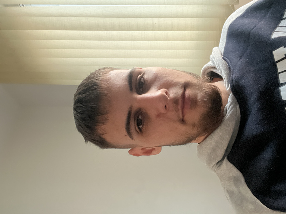 The image displays a head-and-shoulders portrait of a young adult male, estimated to be in his late teens or early twenties, captured indoors