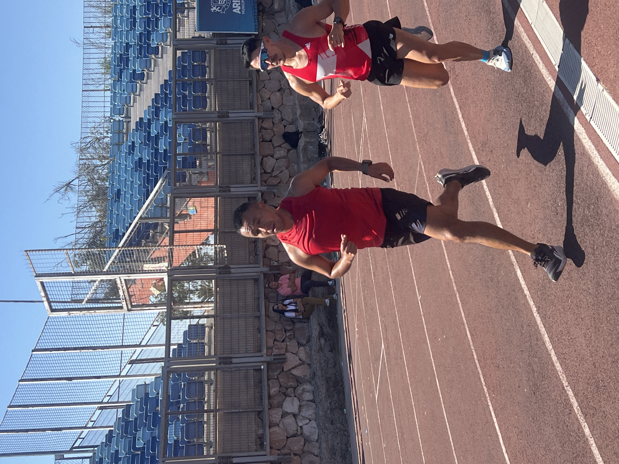 The image captures two male athletes running on a track within the Carlos Dittborn Stadium in Arica, Chile. Both are wearing athletic attire, including red shirts and dark shorts, and appear to be in motion, possibly during a race or training session. The stadium's blue seating is visible in the background, as is part of the arena's fencing. A small group of people are seen seated near a stone wall. The track itself is marked with white lines. The sun casts a long shadow.