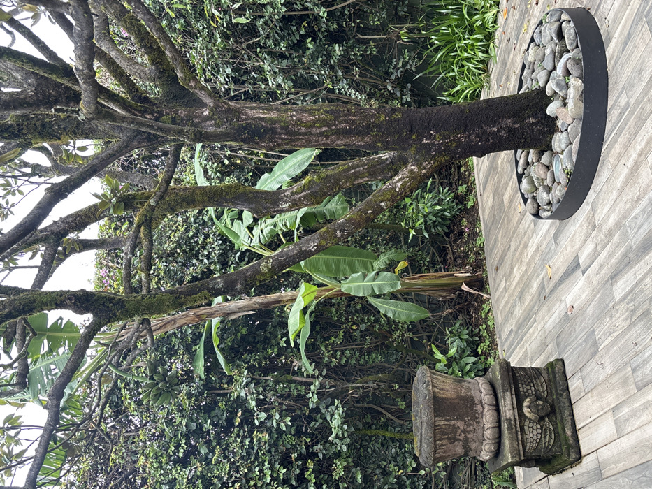 This image captures an outdoor garden scene in Tetela Del Monte, Mexico. The foreground features a light-colored, wood-patterned tiled patio floor. To the left, a weathered gray stone urn with an ornate rim sits atop a square stone pedestal featuring carved details, including a stylized face flanked by scrolled elements. In the mid-ground, a prominent tree with a thick, multi-trunk base and numerous branches extends upwards, its bark heavily covered in green moss. The base of this tree is encircled by a black metal ring filled with various river stones. Behind this tree, several large-leafed banana plants are visible, one of which bears a cluster of green, unripe bananas hanging from its stem. The background consists of a dense wall of dark green foliage, appearing as a variety of bushes and smaller trees, indicating a lush, overgrown environment. No people are present, and no actions or interactions are depicted.