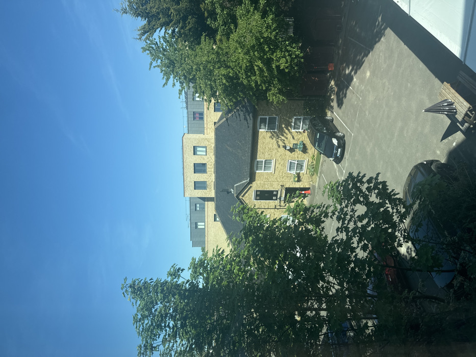 view from a window in Cambridge, UK (52.192, 0.135). The scene is a small, paved parking lot with a black car parked in the center. To the left of the parking lot, there is a tree with lush green leaves obscuring part of the view. Behind the tree is a two-story brick building with a black roof and several windows. The building is made of light brown bricks. To the right of the parking lot is a larger tree with thick, green leaves, obscuring the view of the building behind it. The sky is clear blue. The parking lot is mostly empty, with a few shadows cast by the buildings and trees. There is an orange cone visible near the entrance to the building. A small section of a white tent is visible in the lower right corner of the image, along with a white umbrella on a table. The image was taken on a sunny day.