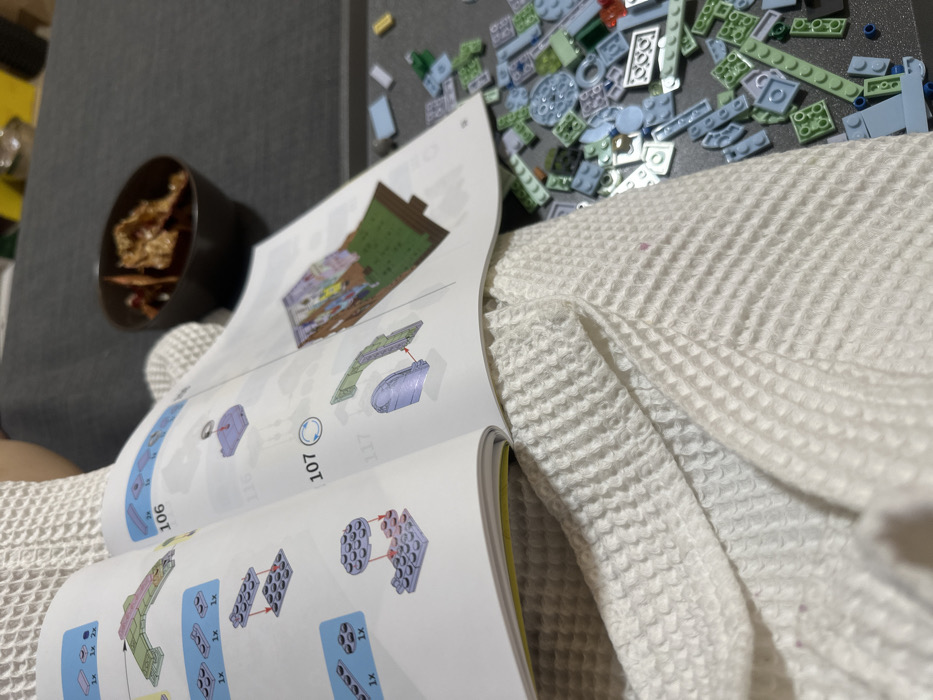 The scene, set in Vsevolozhsk, Russia, depicts an indoor environment focused on construction toy assembly. An open instruction manual, likely for LEGO-style bricks, is centrally positioned, displaying detailed diagrams for assembly steps, specifically steps 106 and 107, which involve light purple/lilac and light green plastic components. A partially constructed model, appearing as a building with a green base, is visible on the right page of the manual. To the right of the manual, a collection of loose plastic construction bricks in various shades of light blue, light green, light purple/lilac, white, and dark grey/black are scattered across a dark grey surface. A human arm, partially obscured by white waffle-knit fabric, rests beneath the manual. In the background, a dark brown bowl containing snacks, possibly dried fruit or nuts, is visible. A faint pink discoloration is present on the white waffle-knit fabric. The dark grey surface beneath the bricks and in the background is consistent with upholstery, such as a sofa or bed.