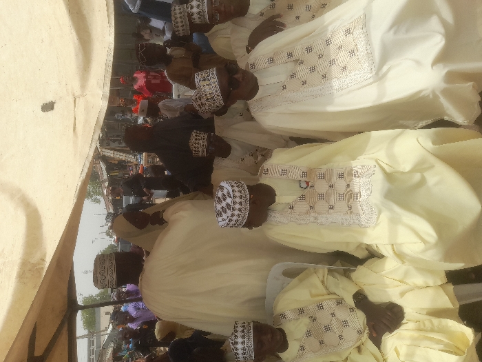 The image depicts a group of men, primarily in white robes, sitting under a white canopy. They are arranged in a line, facing forward, with their heads covered by white and black skullcaps. The scene is likely a public gathering or ceremony. Many of the men wear white robes with intricate brown and white patterns on the chest, while some have white robes with lace trim. One man wears sunglasses and has a darker complexion than the others. There are a few white chairs behind the men. The image was taken in Gusau, Nigeria, located at the coordinates 12.165 latitude and 6.679 longitude. The location is likely outdoors, with a blurry background of buildings, trees, and other people.
