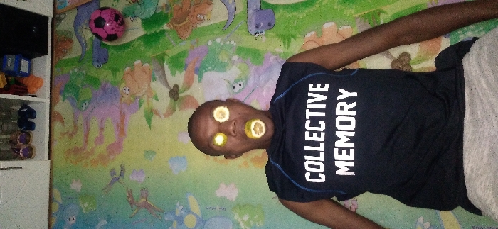 A man lies sideways on a colorful, child-themed wallpaper. He wears a dark blue shirt with the phrase "COLLECTIVE MEMORY" printed vertically in white on the back. Three lemon slices are positioned on his face; one on each eye and one in his mouth. To the left is a white shelf with a black box and colorful toys. Above, there is a pink soccer ball stuck in the wallpaper.