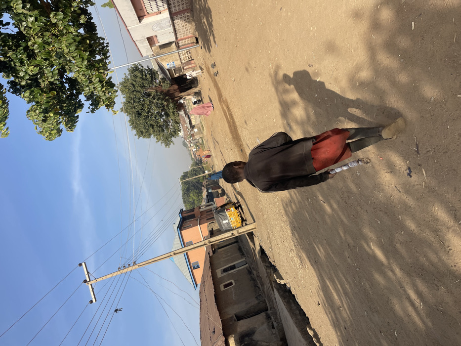 A boy in a black shirt and red shorts is walking on a dirt road. He is holding what appears to be a wrapped object. The sun is shining brightly, casting a shadow of the boy. The surroundings include buildings, trees, and power lines. In the distance, a yellow tricycle can be seen. The image is rotated slightly, giving a tilted perspective.