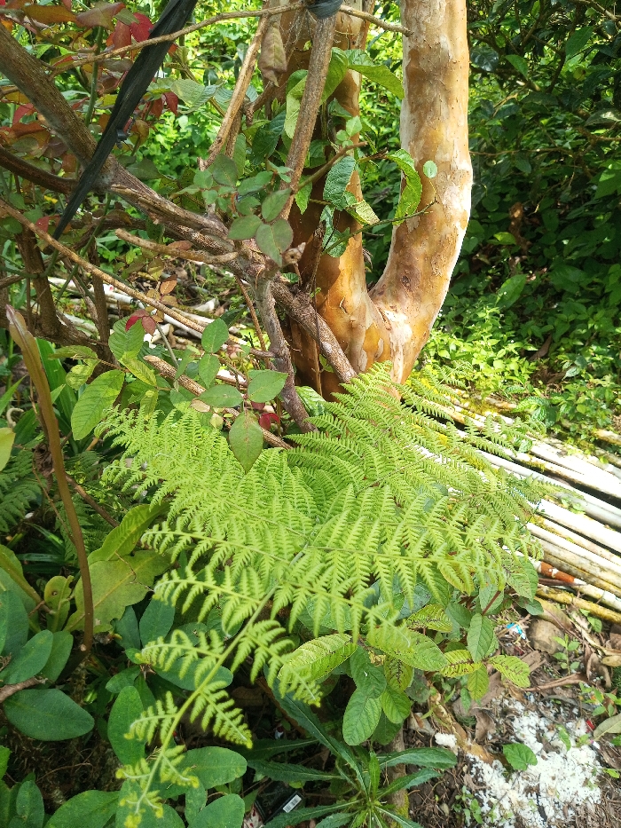 The image displays a dense outdoor vegetated area located within the city of Neerveli, Sri Lanka. A large, bright green fern with intricately segmented fronds dominates the lower-center of the frame. To the right, a light-brown tree trunk, exhibiting sections of peeling bark, ascends vertically. Numerous other green plants and bare, intertwining branches with scattered green and reddish leaves fill the background and foreground. In the upper-left quadrant, a dark, strap-like object is secured around a thin branch. On the ground in the mid-right, several light-colored, cylindrical objects, resembling cut bamboo or wood, are visible horizontally. The ground surface in the lower-right includes visible soil and scattered white particulate matter. No individuals or discernible human activity are present.