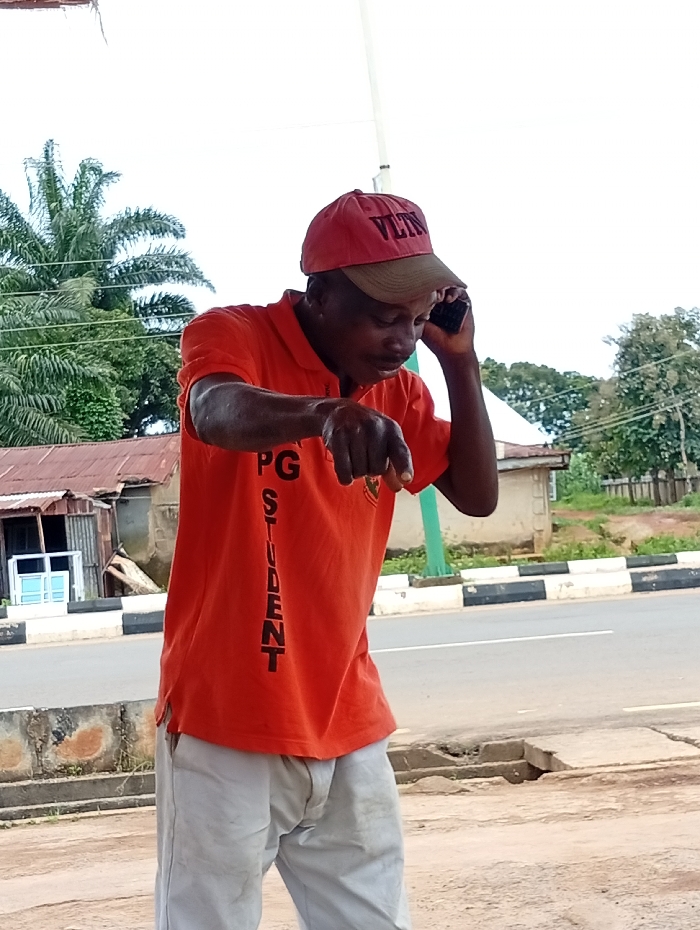 An adult male stands outdoors in Kaninkon, Nigeria, positioned on a dirt and cracked concrete roadside next to a paved street. He wears a red baseball cap with a beige brim, an orange polo shirt vertically emblazoned with "PG STUDENT" in black lettering, and light-colored trousers. He holds a black smartphone to his right ear, engaged in a call, while simultaneously pointing forward and slightly downwards with his left index finger. The background features a corrugated metal-roofed structure with blue-framed windows to the left, and a paved road with a black and white striped curb to the right. Green foliage, including palm trees, and distant buildings are visible under a bright sky.
