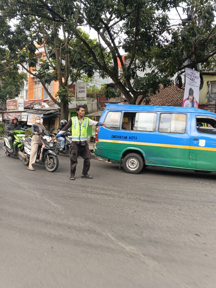 The image depicts an urban street scene in Bandung City, Indonesia, during daylight hours. A male individual, approximately 30-40 years old, stands centrally in an asphalt roadway, facing left. He wears a bright green reflective vest over a dark long-sleeved shirt, dark cargo pants, and dark flip-flops. His right arm is extended horizontally, pointing towards a light blue and green public minivan (Angkot) with "ANGKUTAN KOTA" printed on its side and route number "88" visible on the passenger window. The Angkot appears to be stationary or moving slowly, positioned parallel to the male figure on the right side of the frame. Behind the male figure, three motorcycles are stopped or moving slowly in a single file line. The first motorcycle, a green scooter, is ridden by a male wearing a dark helmet. The second, a dark scooter, is ridden by a female wearing a light-colored hijab, a white face mask, and light-colored clothing. The third, another dark scooter, is ridden by a male wearing a dark helmet. The background features various commercial and residential buildings, including a prominent orange-colored building on the left and a white building with a "TOKO AGUS" sign. Large, mature trees with green foliage line the street, partially obscuring the sky and upper sections of the buildings. A white banner with the text "GREAT FIRST STEP" is visible hanging from a pole on the far right.