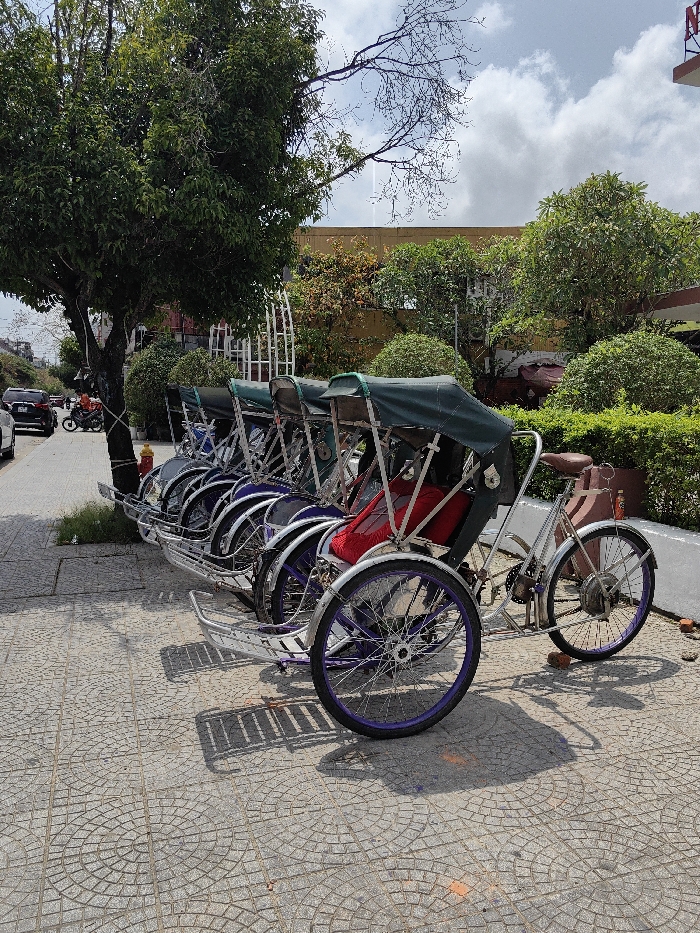 - "The image captures a street scene in Vỹ Dạ Ward, Vietnam, featuring a row of six parked cyclos (pedicabs) on a grey patterned tiled sidewalk" by FM-gnqSa2, licensed under CC BY 4.0