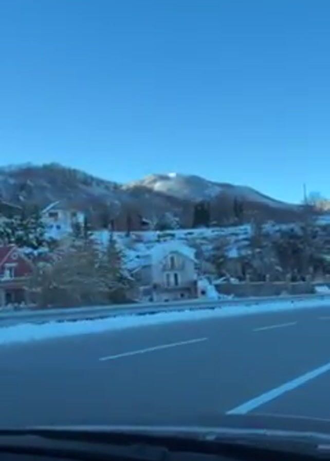 A car drives along a highway through a snowy mountainous region under a clear blue sky. Houses nestled among snow-covered trees can be seen on the left side of the road. Mountains are visible in the background, also covered in snow. The road is mostly clear of snow, with only thin lines of snow along the edges. Power lines run parallel to the road. The footage is taken from inside the car, looking out through the windshield.