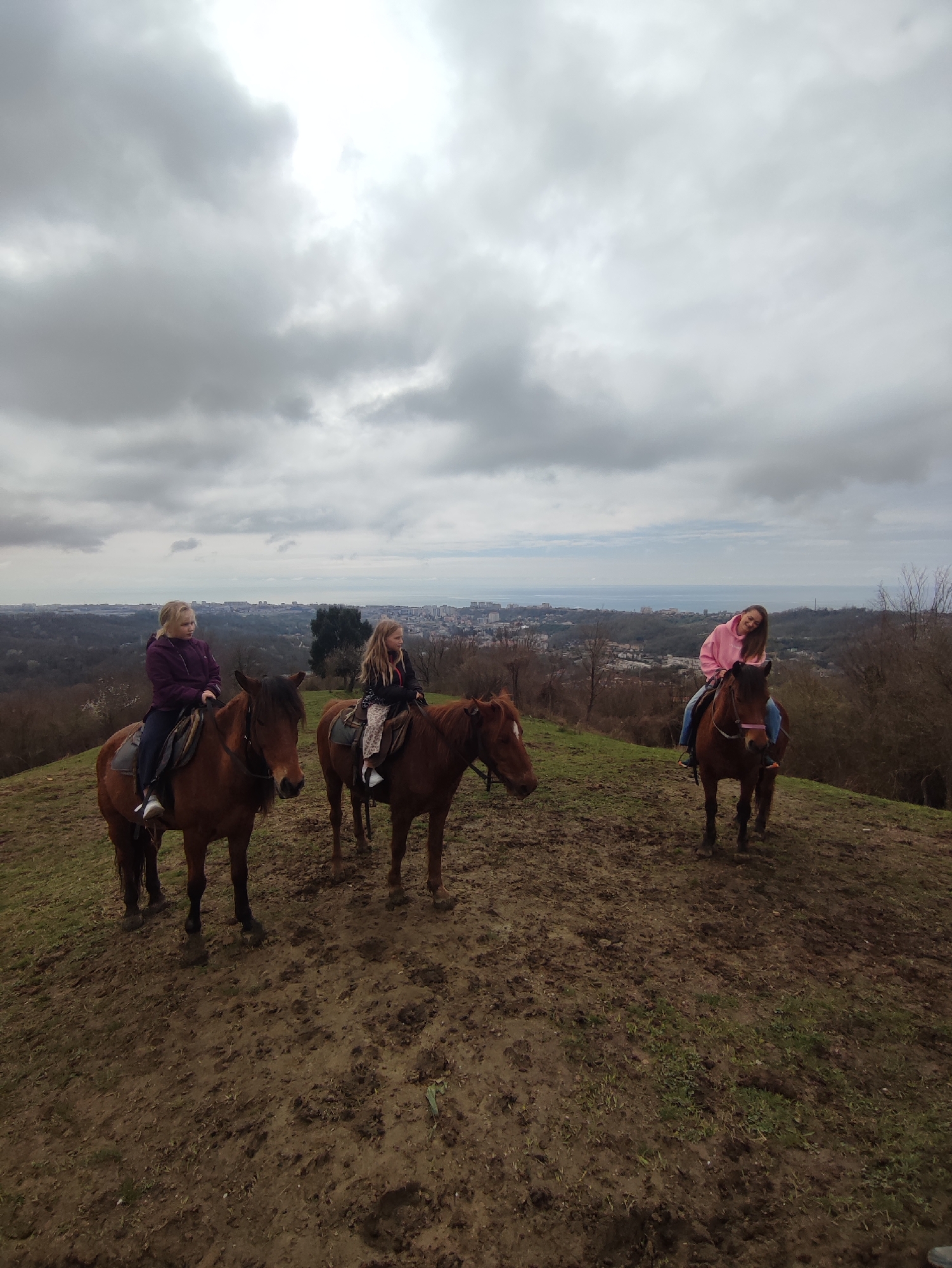- "The image depicts three individuals on horseback on a muddy, grassy hillside in Bestuzhevskoye, Russia, with a sprawling coastal city and the Black Sea visible in the background under an overcast sky" by FM-sFCoH2, licensed under CC BY 4.0