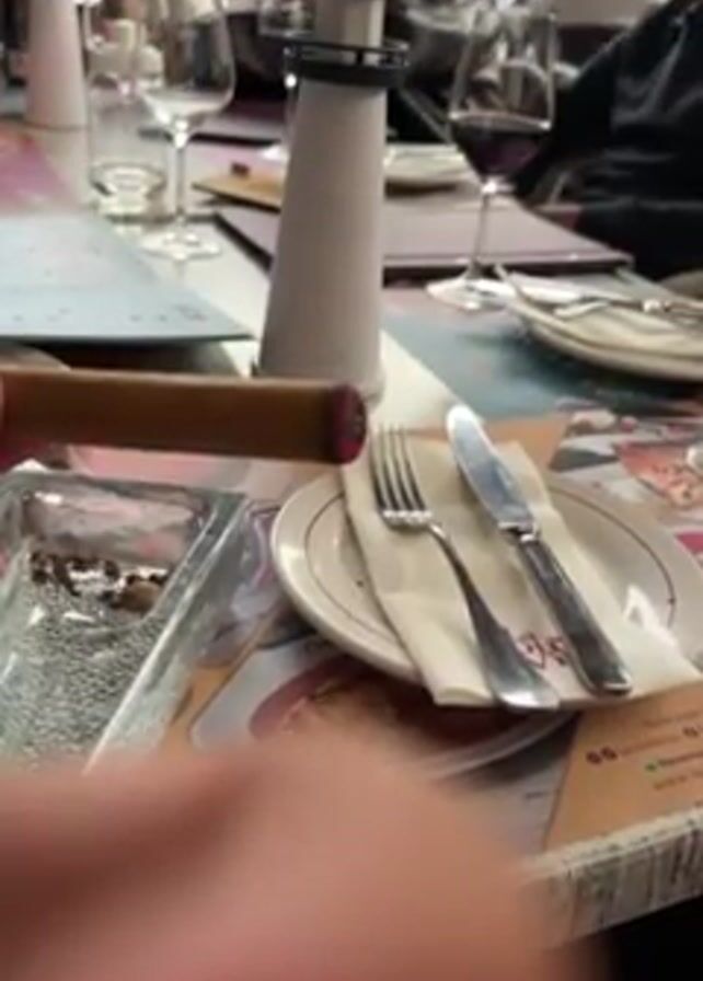A person is lighting a cigar with a black torch lighter at a table in an outdoor restaurant