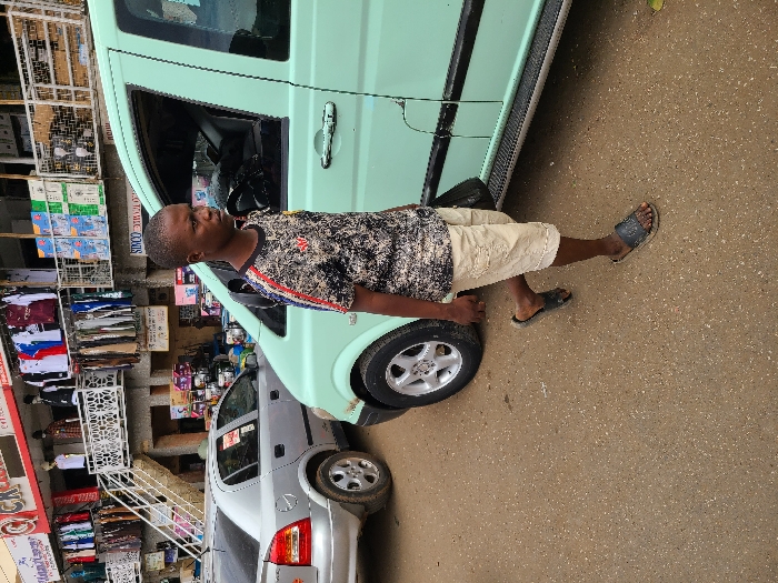 The image displays an outdoor street scene in the city of Unknown, Unknown, featuring one individual and two vehicles against a commercial building backdrop. A young, dark-complexioned male, with short hair and wearing a patterned short-sleeved t-shirt with shoulder stripes, light-colored cargo shorts, and dark slip-on sandals, walks from left to right across the foreground. He carries a small dark object in his left hand. To the immediate right of the individual, a light green panel van, consistent with a Mercedes-Benz Vito, is stationary. Behind the individual and to the left, a silver Opel Astra hatchback is also stationary. The background consists of a multi-story building, likely commercial, with an external white-railed staircase leading to an upper level. Both levels feature open-air merchandise displays, including clothing racks with various garments and shelves with packaged goods. Partially visible signs, including "CK" and "Sinco," are affixed to the building. The ground is a light-colored paved surface, illuminated by natural daylight.