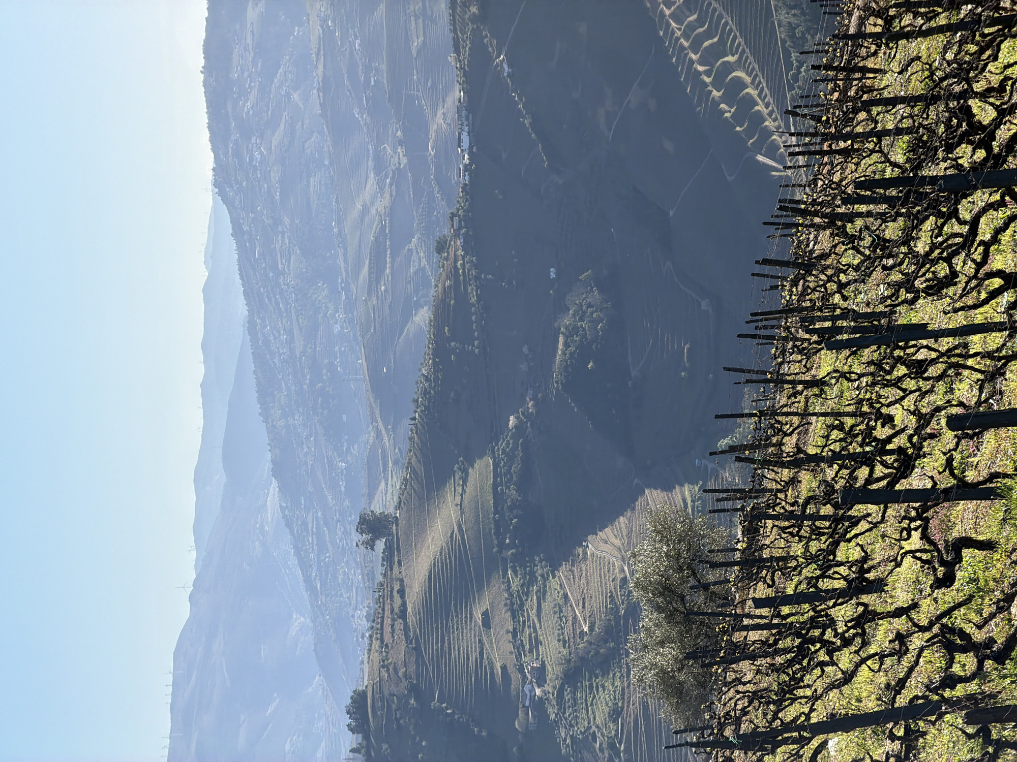 The image captures a terraced hillside near Vila Real, Portugal, showcasing a landscape shaped by agriculture. In the foreground, rows of grapevines supported by wooden posts extend across the frame. The vines are dormant, with bare branches forming intricate patterns. Between the rows, patches of green vegetation suggest the onset of spring. Beyond the vineyard, the hillside descends in a series of terraces, covered with cultivated fields. The backdrop consists of hazy mountains receding into the distance under a clear sky. The scene is quiet, with no people or discernible activity visible.
