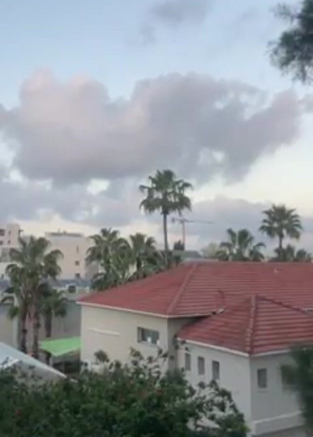 view of a residential area under a cloudy sky. Several palm trees dot the landscape, interspersed with buildings. The foreground includes a white house with a red tile roof. Lush greenery, potentially bushes or trees, occupies the lower part of the frame. In the background, there is a glimpse of other buildings and what appears to be a construction crane in the distance. The overall scene gives a sense of being in a warm, urban environment with significant vegetation.