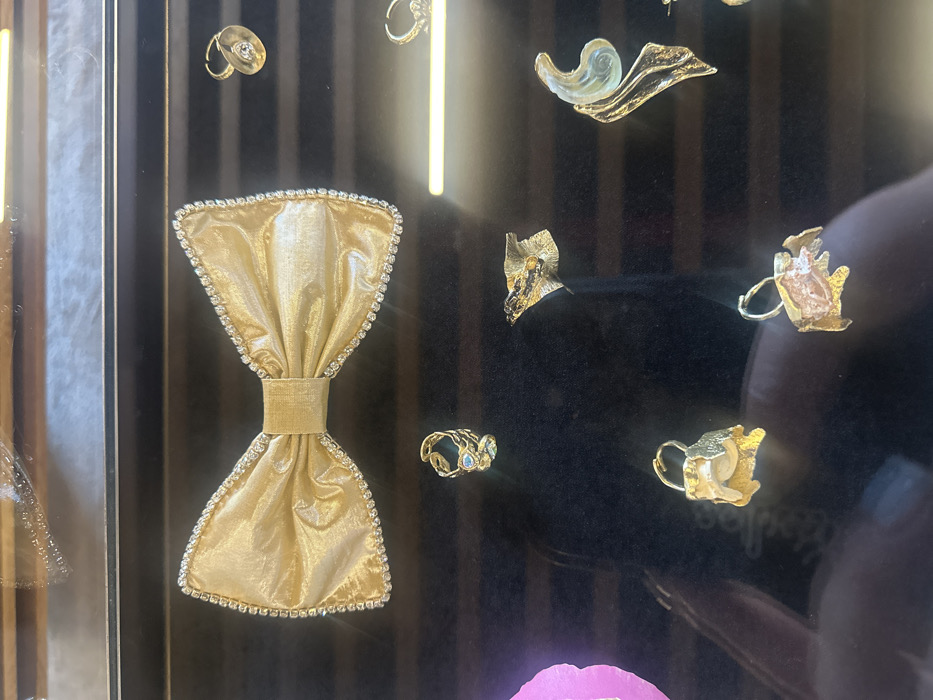 The scene depicts a retail display case showcasing various jewelry items, located within a boutique in Tbilisi, Georgia. The background is a dark, uniform surface, likely black velvet. A prominent, golden, bow-tie-shaped item, approximately 15-20 cm in width, is centered in the upper portion of the frame. Its entire perimeter is edged with a continuous line of small, clear, reflective stones. Below and to the right of the bow-tie, several smaller, gold-toned jewelry pieces are arranged. These include: * An open-band golden ring featuring multiple small, light blue or iridescent stones, positioned in the middle-left. * A golden ring with a central round, clear stone, situated in the upper-right. * Two irregularly shaped golden pendants or earrings, each containing a pale, spherical bead, located in the lower-left. * An abstract, textured golden piece, positioned in the mid-right. * Another abstract golden piece, featuring a translucent, swirled, pale blue or green insert, visible in the lower-mid-right. The display is viewed through a reflective glass surface. Indistinct reflections are visible, including horizontal light streaks and the faint outline of a person, specifically a hand and arm in the lower-center of the frame. No specific individuals are clearly identifiable, and no discernible actions or interactions are occurring. The environment is an interior retail setting.