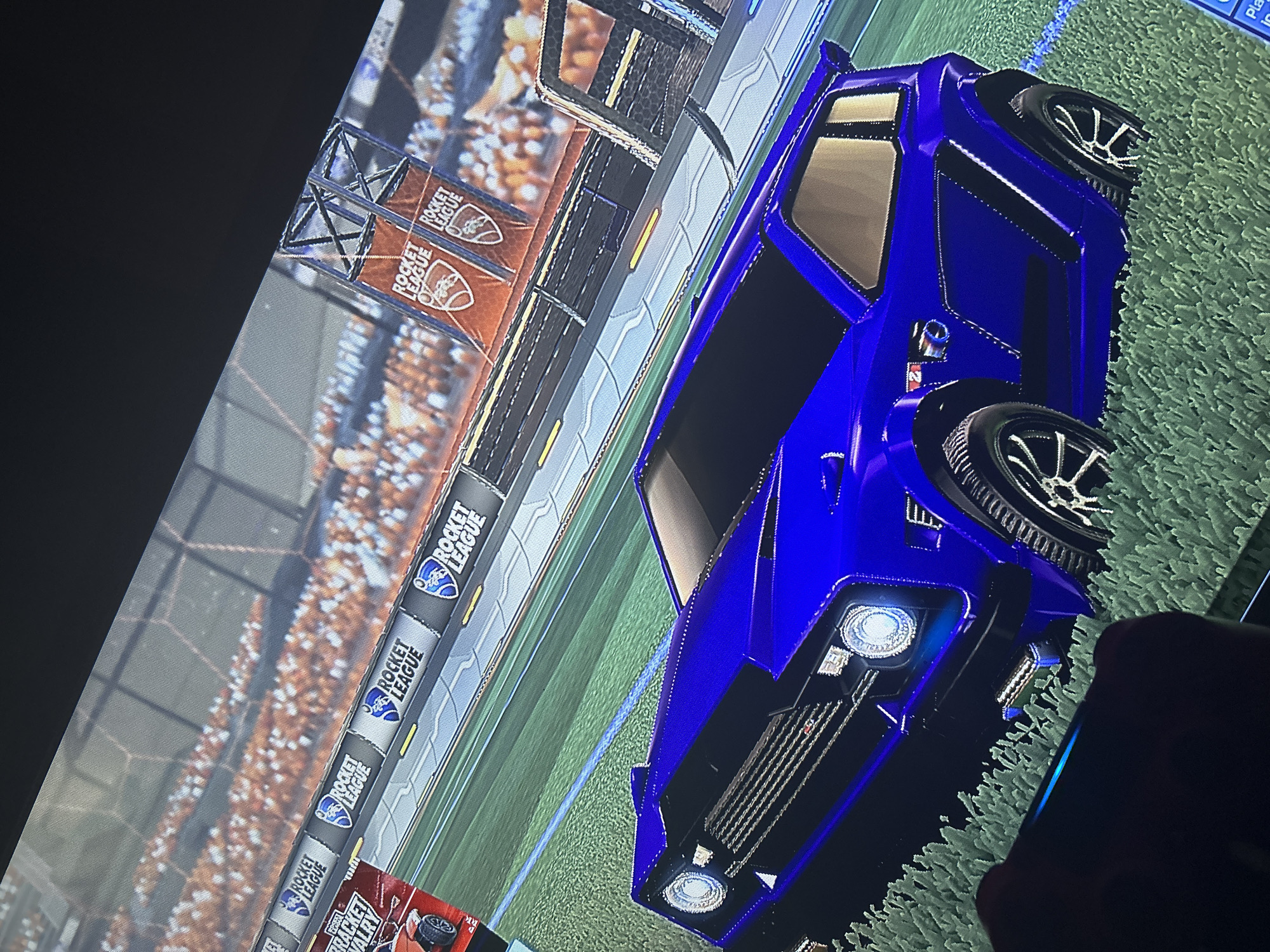 A photograph captures a digital screen displaying a scene from the video game Rocket League