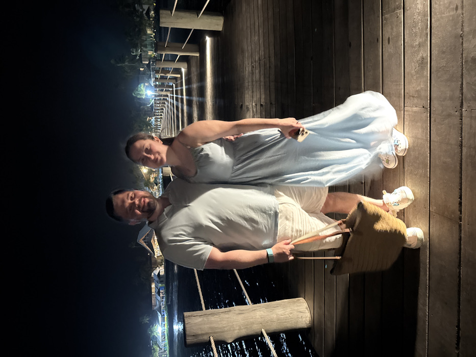 A man and woman pose at night on a wooden pier. The woman, in a light blue dress, holds a phone. The man wears a light blue shirt and white shorts, holding a straw tote bag. They stand on a wooden boardwalk with lights visible in the distance. A rope railing separates them from the dark water below. The photo is taken at an angle, with the pier extending towards the background.
