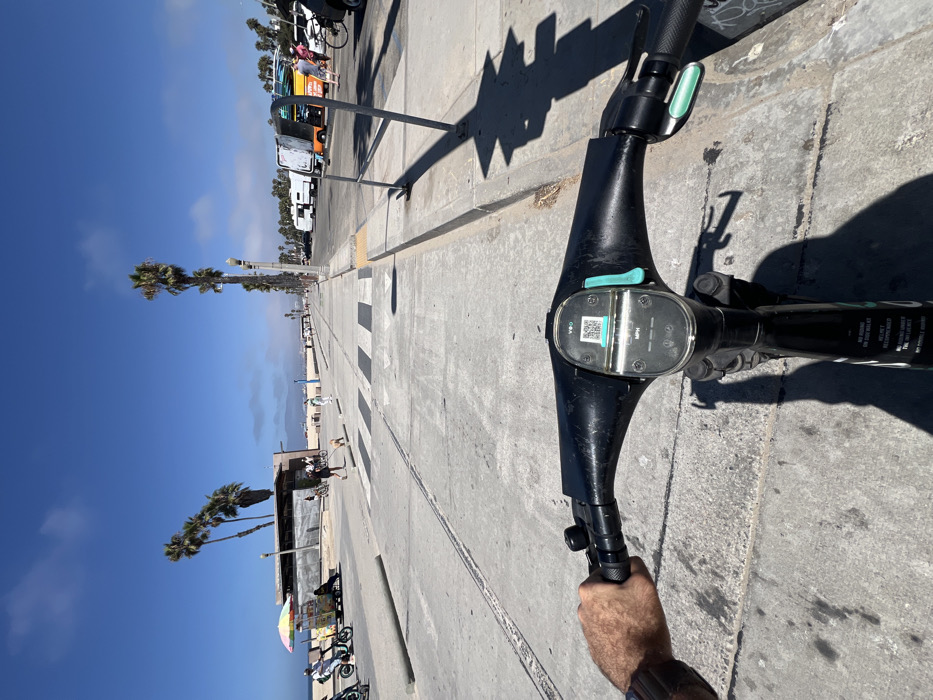 A first-person perspective image captures a sunny day on a multi-use path along Santa Monica State Beach in Santa Monica, California, United States